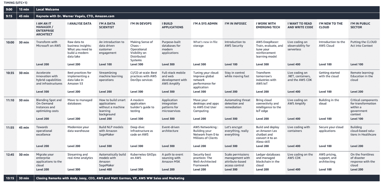 As with any AWS event, there’s a huge amount of choice available in terms of sessions, and the online summit is no exception. This year, AWS have adopted role-based tracks, as you can see in the agenda above.