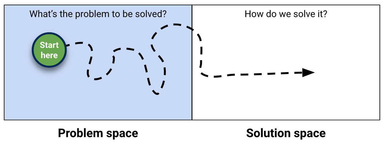 When a team solves a problem by starting in the problem space and first understanding their customers’ problems, they minimise rework and maximise results, whilst also creating a sense of common purpose in the team. By the time they begin to craft a solution they have greater confidence that it relates to an important problem their customers are facing. Problem solving is - of course - not entirely linear. Teams will need to regularly return to the problem space as they progress in solving a problem.